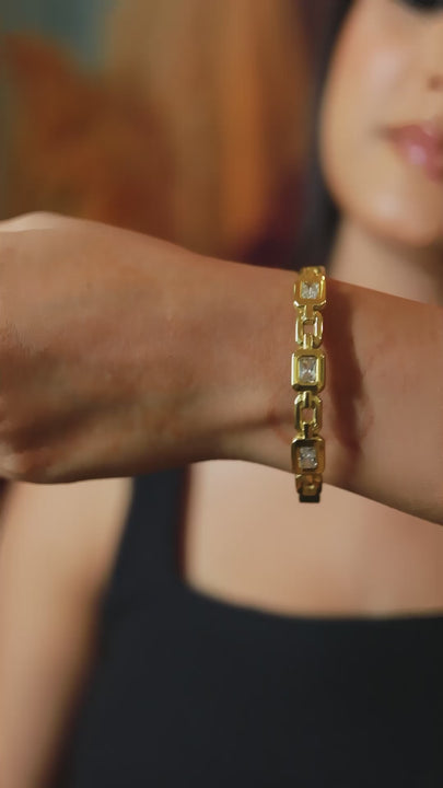 Elegant link bracelet showcasing rectangular gold-toned segments set with sparkling clear stones, perfect for a refined, minimalistic look.