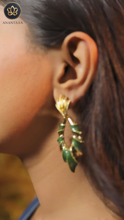 Bold statement earrings with an edgy leaf-inspired open frame, featuring deep green enamel sections outlined in luxe gold for a dramatic, fashion-forward look.