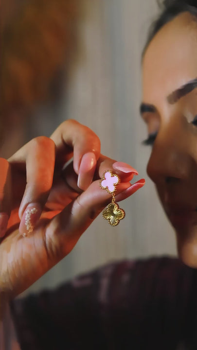 Dangle earrings with a quatrefoil design, featuring an upper soft pink enamel charm and a lower textured gold quatrefoil for a vibrant, feminine touch.