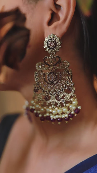 Show-stopping statement chandbali earrings with intricate cutwork, sparkling stones, and lush layers of ivory pearls and maroon beads, perfect for weddings and grand celebrations.