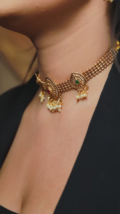 Traditional jewellery set featuring a regal choker necklace and matching drop earrings, embellished with intricate designs, for an opulent ethnic look.