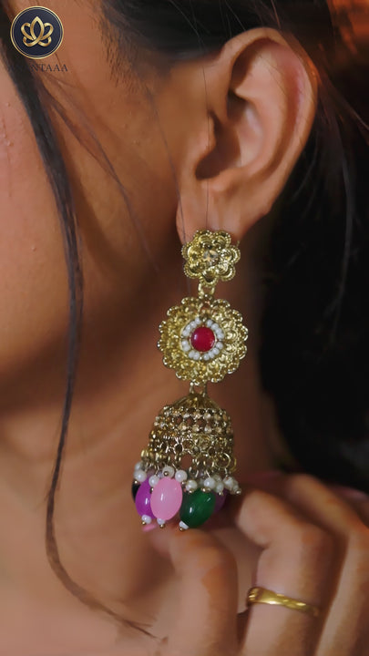 Festive long jhumka earrings featuring layered floral studs, a kundan-style central motif, and pearl-encrusted dome with colourful bead drops for a playful yet regal finish.