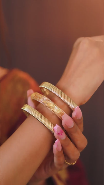 Set of sleek gold-tone cuff bangles featuring a mix of smooth and textured finishes, perfect for stacking with ethnic or contemporary outfits.