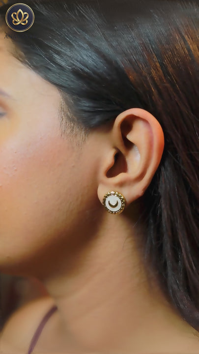 Classic round stud earrings featuring a white enamel center framed by a textured gold border and a sleek crescent detail for subtle modern charm.