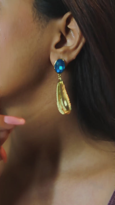 Elegant drop earrings featuring a vivid ocean-blue faceted stone paired with a delicate open gold teardrop cage for a light, graceful movement.IMG_20251130_125831.jpg